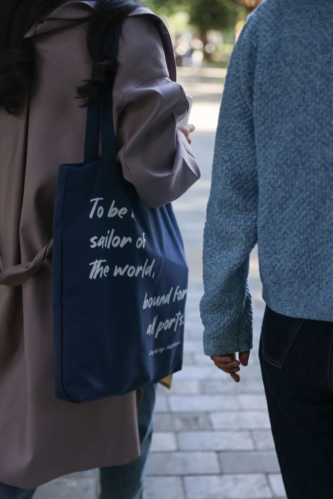 张秋子的帆布包上印着「做世界的水手,游遍所有港口」字样。