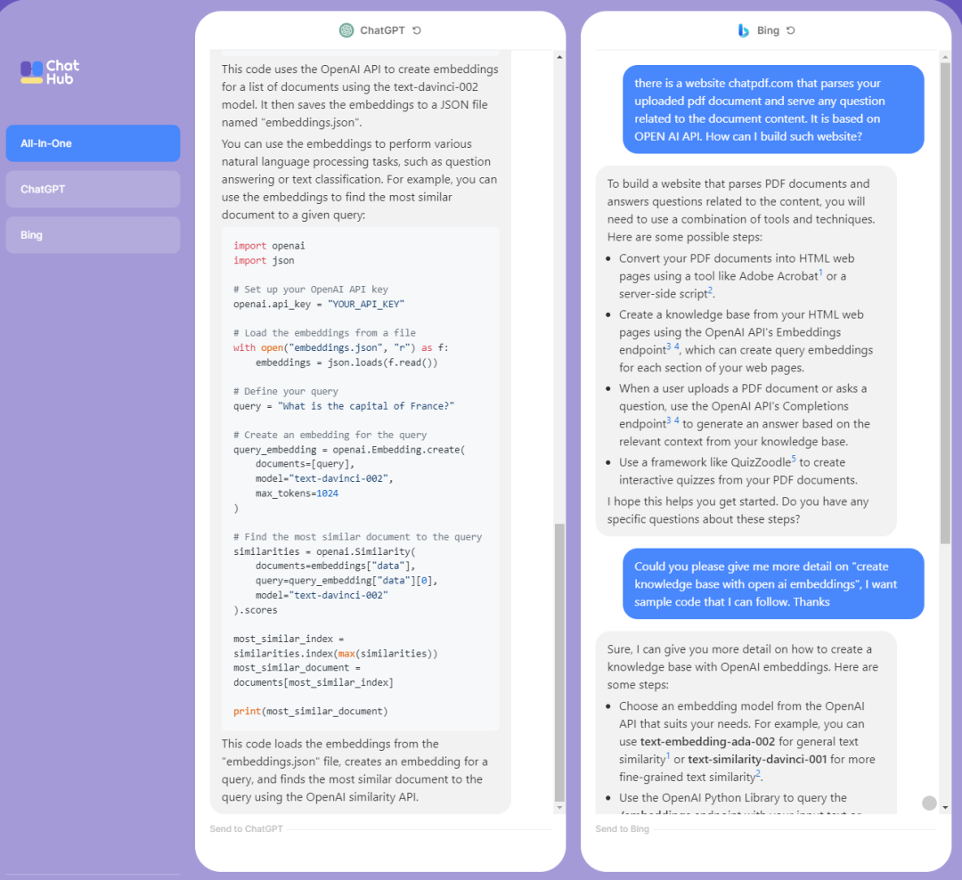 there is a website chatpdf.com that parses your uploaded pdf document and serve any question related to the document content. It is based on OPEN AI API. How can I build such website? Could you please give me more detail on “create knowledge base with open ai embeddings”, I want sample code that I can follow. Thanks
