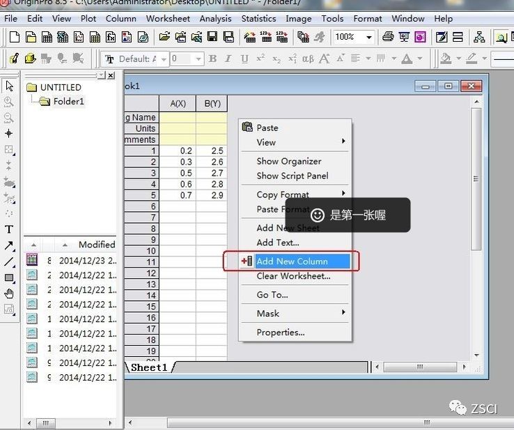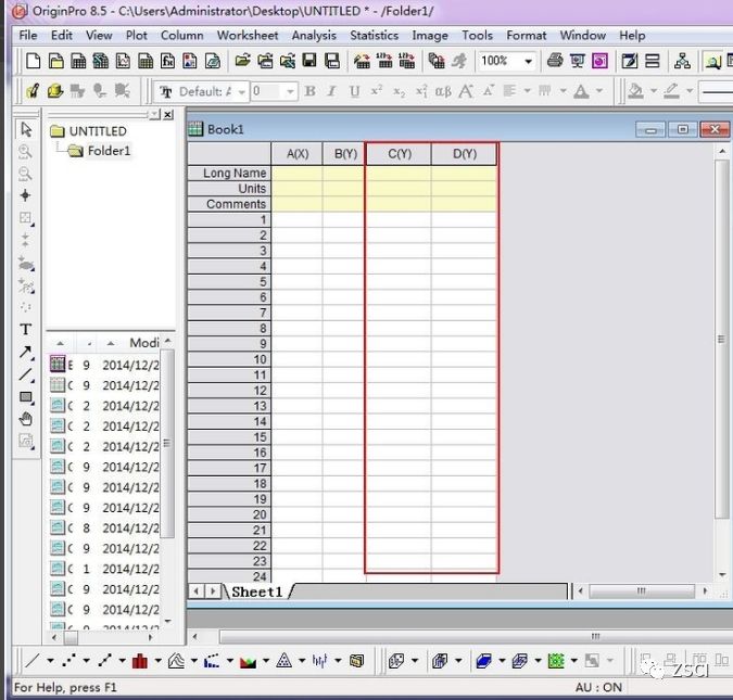 在 Book1 数据空白处,单击右键,选择 “Add New Column”,增加 2 列新的数据单元格 “C(Y)” 和 “D(Y)” 两列数据。