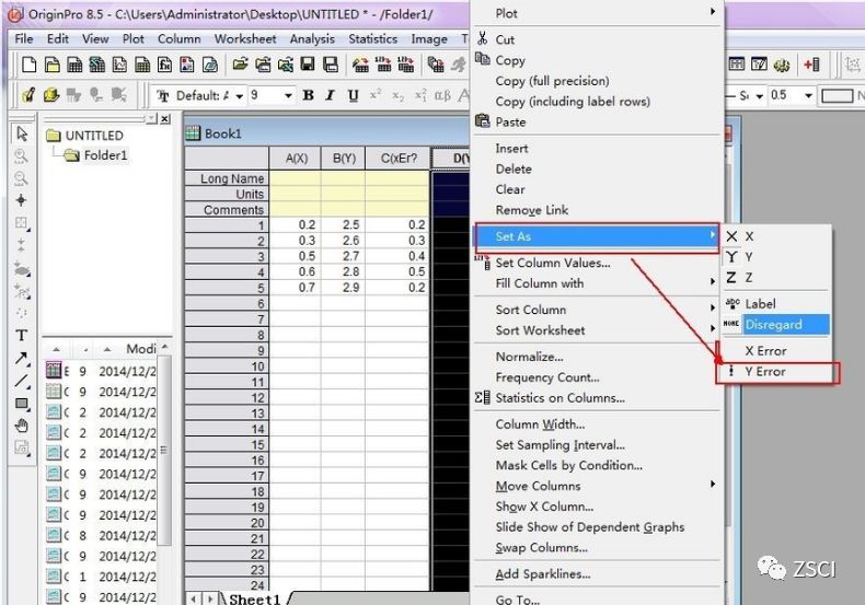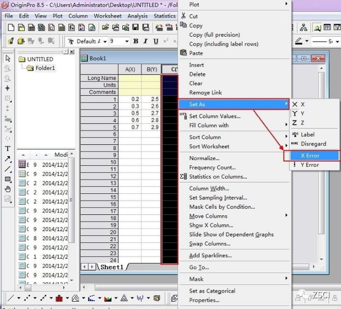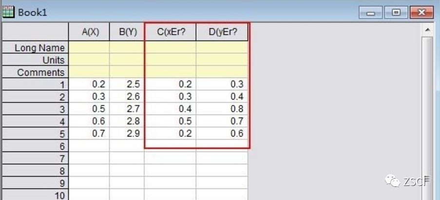 将计算得到的 X 轴数据,平均值,2 列标准偏差分别输入 origin 的 Book1 数据表中,然后选中标准偏差所在列的数据,右键单击,选择”set as“,将 “C(Y)列数据设置为 “ Xerror”,将 “D(Y)列数据设置为 “ Y error ” 将如下图所示: