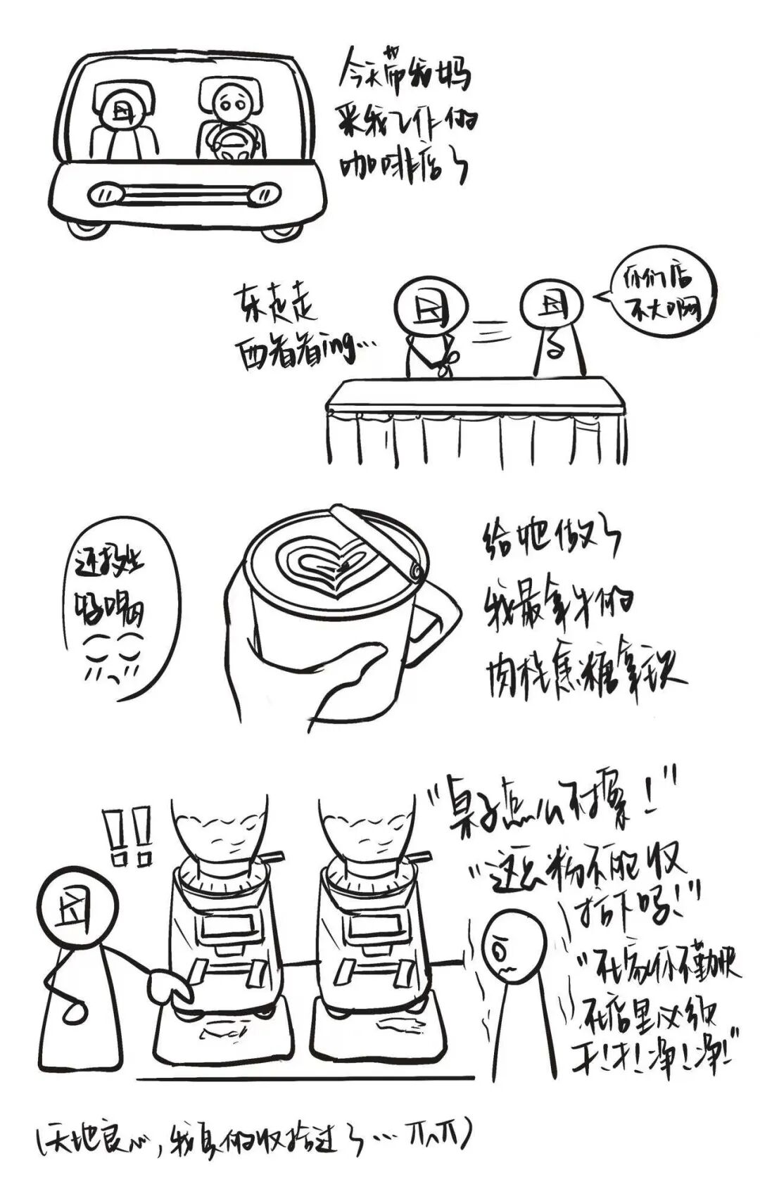现在的生活特别规律。咖啡店不忙的时候,我重拾了画画的爱好。这种有参与感的劳动,也为我的创作提供了丰富的土壤和养料,一切好像变得灵巧起来。我把学到的咖啡知识画成漫画,还画店里的人,画与咖啡有关的物品,贴在店里,发给我的朋友,也放在社交媒体上,这些小事都给了我非常具体的反馈。