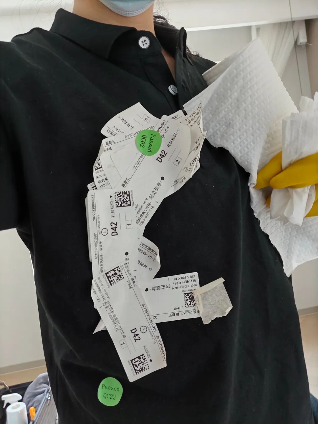 清理完一间屋子,小代身上粘满了标签