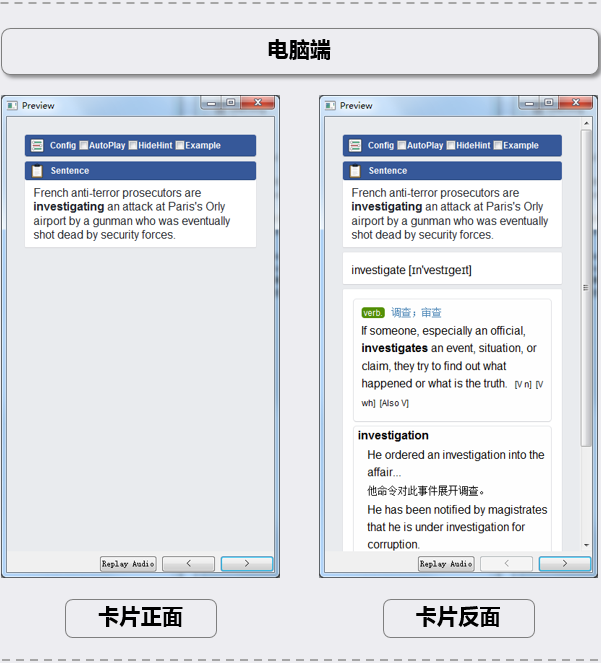 使用 Chrome 浏览器的一款插件 Chrome 划词制卡助手,一边阅读,一边就把单词查询和制卡一键完成了。具体方法详见**《Chrome 插件《Anki 划词制卡助手》使用说明 (含视频教程)》**。如果在 PC 端想阅读文字版的 PDF 文件,可以使用 PDF.js 在浏览器里打开 PDF 文件,然后再用划词助手取词。