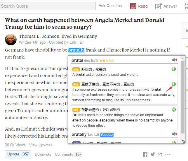 这是一个在 Quora 网页端阅读的划词场景 (看见那个绿色加号没,只点一下,卡片就做好了):