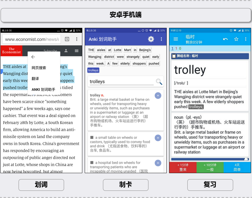 下面是一个安卓手机上阅读经济学人的场景,分别是划词 / 翻译 / 复习界面