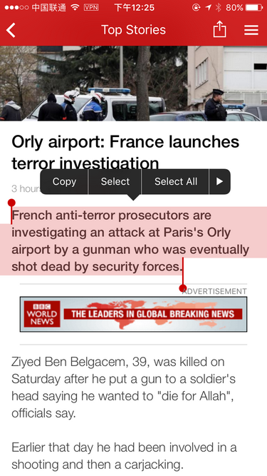 这是一个 iPhone 手机上用 BBC 新闻 APP 阅读的划词场景: