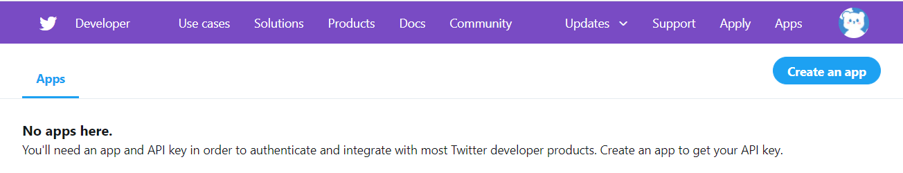 点击后可看到如下页面,点击右上角的create an app